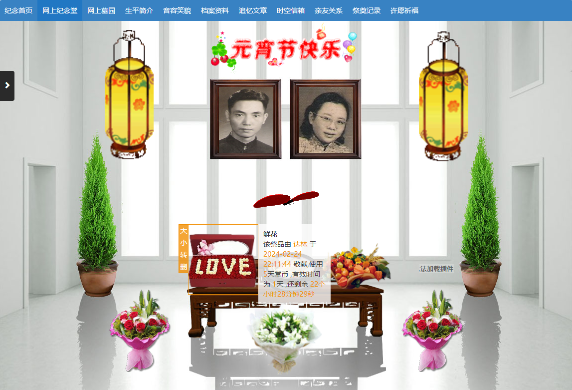 中午进入父母天堂纪念馆,我在墓园里高悬深深思念的彩球。敬献鲜花,香烛,为父亲准备丰盛的美味佳肴,茅台酒,骆驼牌烟,其中少不了外婆的最爱芝麻汤圆。婆婆喜欢的油条。我在纪念堂里悬挂着父爱如山;音容笑貌。准备了鲜花香烛,父亲喜爱的水果桃子和糕点桃酥,加上甜点礼盒,还有两桶金元宝,休闲娱乐的乐器,送父亲的最爱胡琴,母亲的最爱钢琴。还有麻将机,遗憾的是已故长辈们在世时都还没有享用过,现在可以尽情的玩乐了!祝愿父亲与已故亲朋共享女儿对父亲挥之不去的情谊!