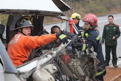 8点半左右,桂林瓦窑消防中队官兵抵达现场。由于客车车头变形严重,司机被牢牢夹在驾驶室内,他上半身靠在车门上,左手垂出车外,满脸是血;另一名被撞晕的中年男子,倒在车厢内情况不明,急需救助。